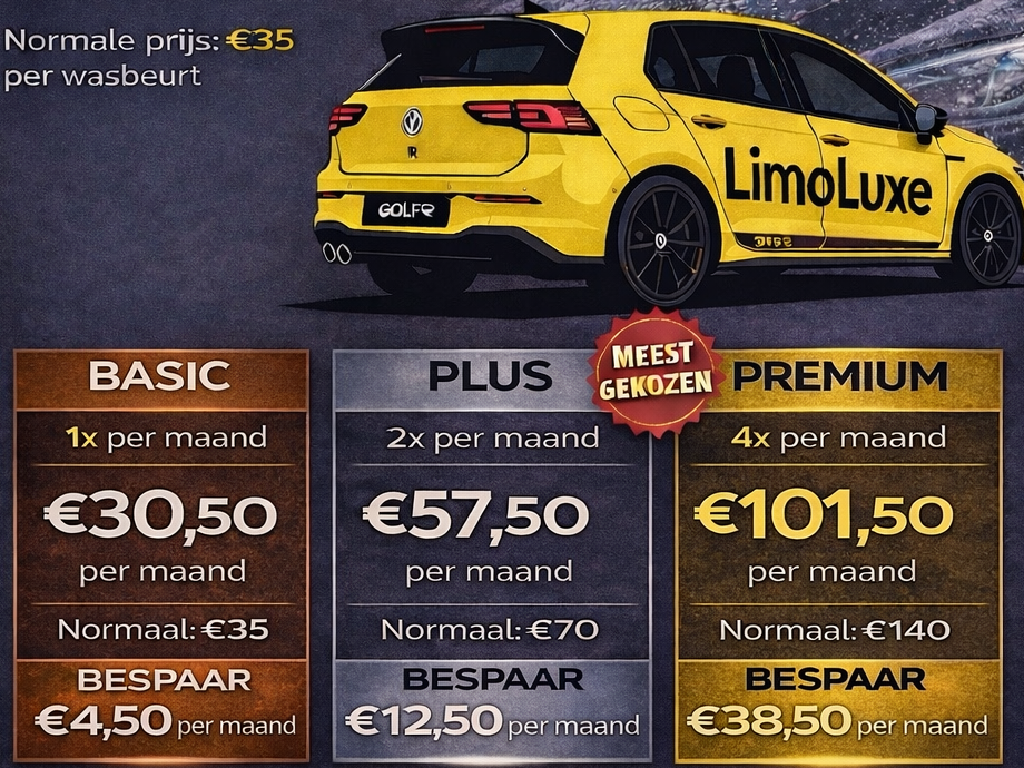 Met een Limoluxe abonnement blijft uw auto altijd glanzend, fris en representatief. Professionele reiniging, hoogwaardige producten en aandacht voor elk detail – gemak en luxe in één.